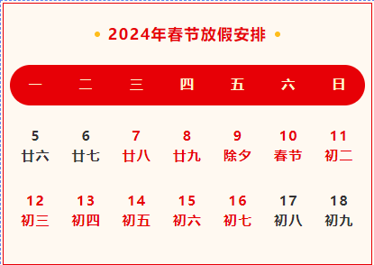 2024年春节将至,根据国家有关政策,同时结合公司相关规定,现将春节放假通知如下: